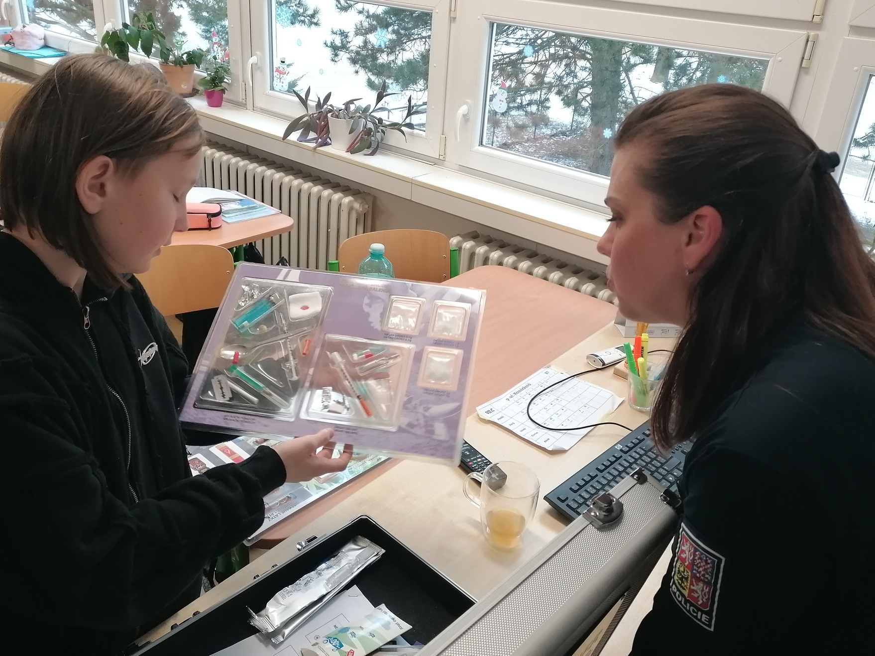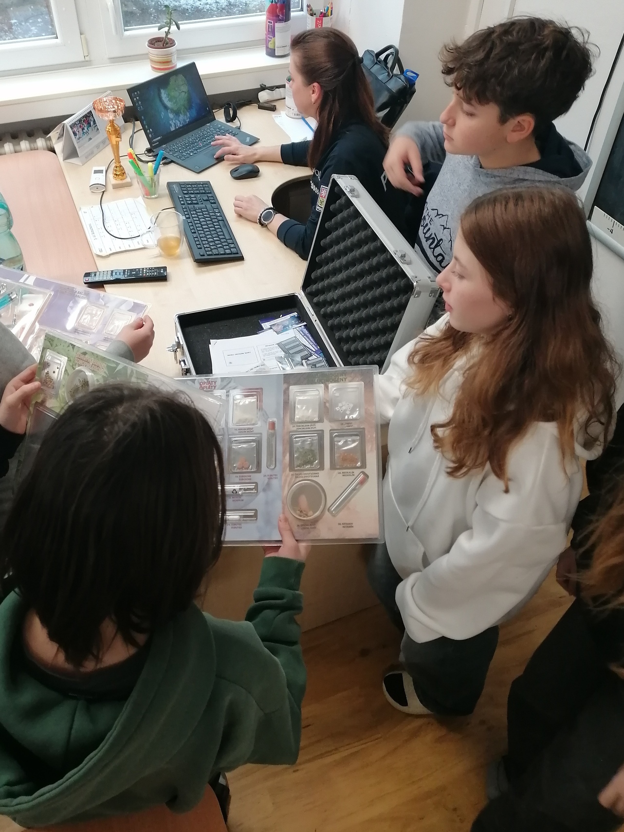 Ten samý den naopak na VII. C čekala přednáška o drogách (tj. návykových látkách). Paní Peterková měla opět připravenou zajímavou prezentaci, která obsahovala plno informací, ale i ilustračních fotografií. Žáci byli seznámeni s dělením návykových látek podle účinku na organismus, podrobně se věnovali tématu kouření, ale i vapování. O nebezpečné novince „kratomu“ toho naštěstí moc nevěděli, ale z výkladu pochopili, že se jedná o velmi problémovou, ale bohužel i velmi populární látku, která má mnohdy devastující účinky na lidské zdraví, zejména v kombinaci s alkoholem či jinými návykovými látkami. Přednášející nezapomněla ani na stručné informace o dalších nikotinových výrobcích, o nebezpečných energetických nápojích, ale i o novinkách v drogovém zákoně a rozebrala stručně i drogové trestné činy – přestupky, pokuty atd. Na obrázcích měli žáci možnost vidět například detailní pohled na lidské oko a jeho zorničku ovlivněnou požitím drogy, dále si prohlédli stimulační a další drogy (pervitin, kokain, extáze, LSD, heroin, fentanyl (syntetický heroin) atd.). V závěru hodiny ještě paní Peterková otevřela svůj tajemný (stříbrný) pracovní kufřík, a děti tak mohly vidět na vlastní oči konkrétní příklady různých návykových látek, což je dle mého názoru zaujalo asi nejvíce (škoda, že nebylo již více času).